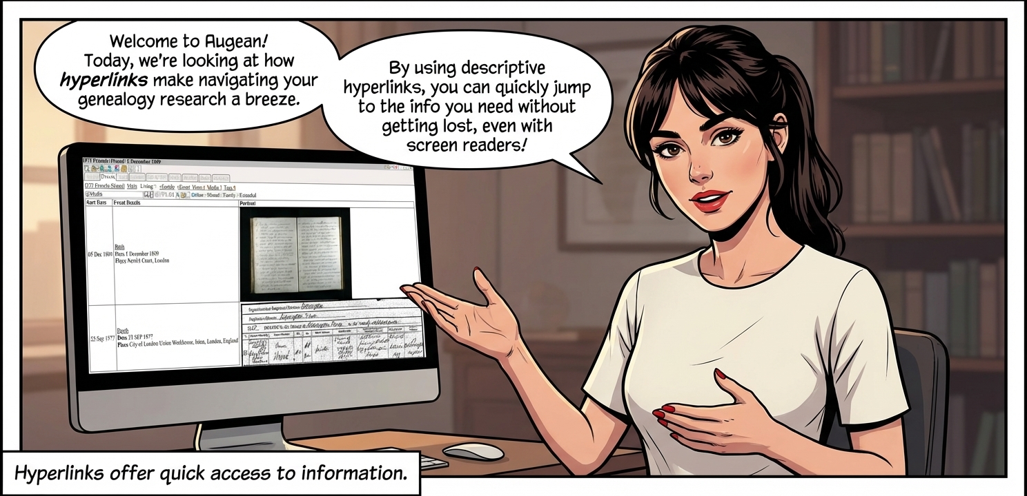 The hyperlink approach used by Augean allows for efficient navigation of genealogy, and cuts down on frustration. It's a big accessibility help.