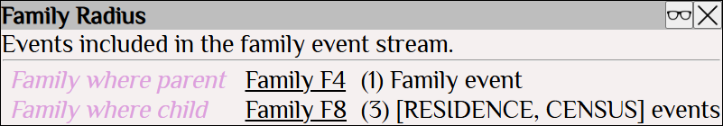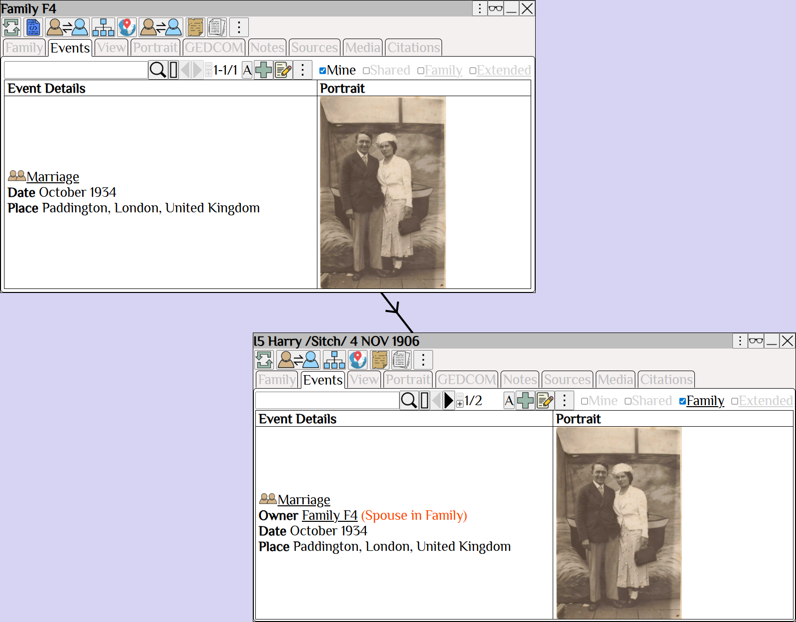 ![]() The arrow connecting the Family and Harry Sitch, shows Harry Sitch was a parent in the Family F4 If you try to add a Marriage event to a person, Augean warns that it should be added to the Family. ![]() Click Family to view the radius of the family events Families listed will have their events included in the extended event stream of the current person. For families were the current person is listed as a child, only the RESIDENCE and CENSUS events are included. ![]() |
