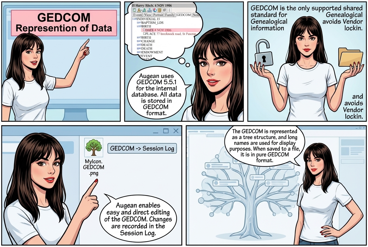 GEDCOM Represention of Data![]() Augean uses GEDCOM 5.5.1 for the internal database. All data is stored in GEDCOM format. Please also see why GEDCOM is an excellent choice for a database GEDCOM is the only supported shared standard for Genealogical information and avoids Vendor lockin. GEDCOM databases can be opened using other Genealogical software. ![]() • Links to GEDCOM structures are shown in Blue • GEDCOM 5.5.1 can be exchanged with other genealogical software without loss of information • All custom GEDCOM tags are preserved when importing GEDCOM. Augean enables easy and direct editing of the GEDCOM. • Changes for each GEDCOM object are recorded in the GEDCOM ⟶ Session Log . • The button is used throughout Augean to provide a view of the GEDCOM. The GEDCOM is represented as a tree structure, and long names are used for display purposes. When saved to a file, it is in pure GEDCOM format. ![]() |