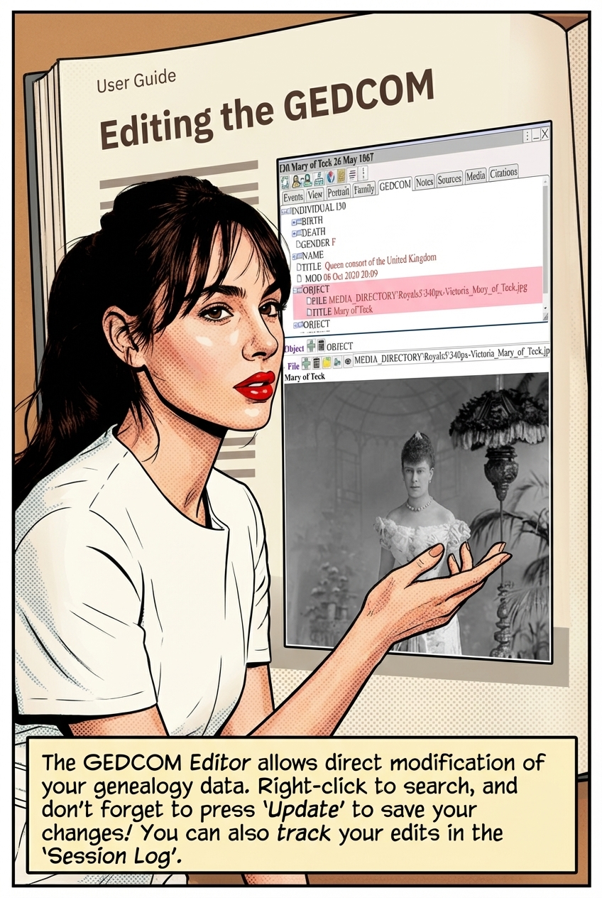 Editing the GEDCOM![]() The GEDCOM editor used for direct editing offers a convenient way to modify the GEDCOM directly ![]() Editing the GEDCOM file • Right Click ⟶ Search to view the search panel. • Press commits changes to the GEDCOM database. • Press ⟶ to view the GEDCOM ⟶ Session Log , which tracks the changes made to the GEDCOM. |