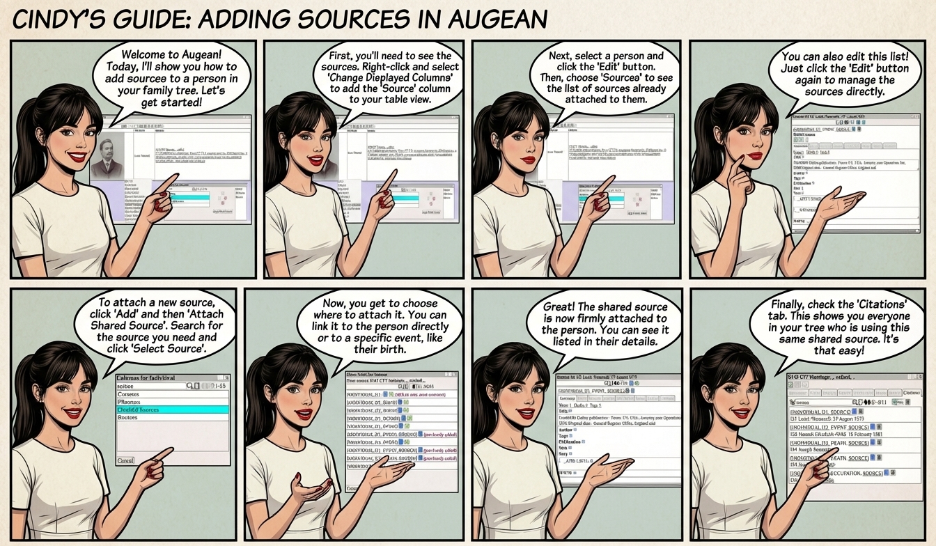 Adding Sources to a Person![]() Sources may be private or shared Shared sources can be shared with other persons in the same GEDCOM file. Private sources can't be shared with other persons. Private sources can be converted to shared sources using ⟶ In this example we add a shared source (adding a private source is similar) Right Click ⟶ Change Displayed Columns to add the Source column to the table. ![]() and select Sources to view the list of sources for a person. ![]() to edit the list of sources ![]() ⟶ Search for the source and ![]() Choose where to attach the source. ![]() The shared source is now attached. ![]() The citations for the source show who is using the source. ![]() |