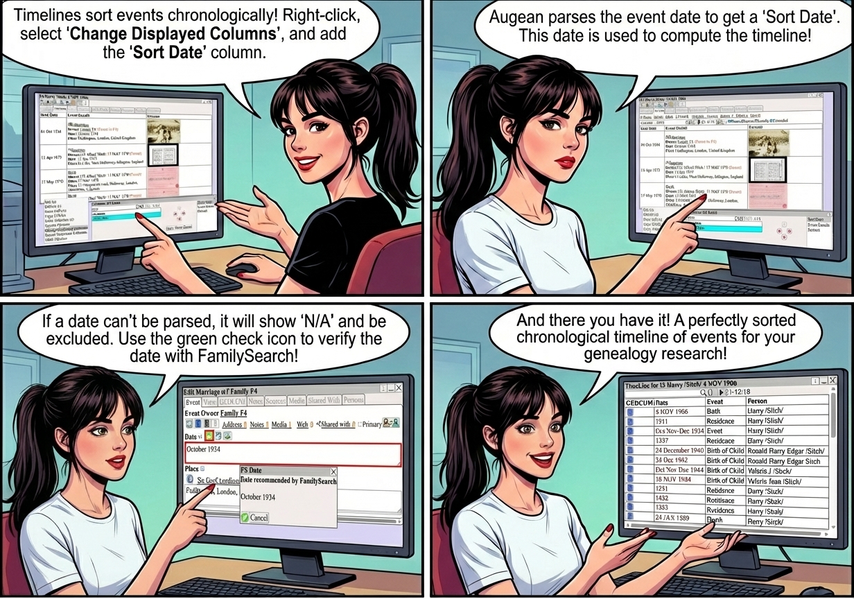 Viewing Time Lines![]() Time Lines are used to sort events into chronological order. Right Click ⟶ Change Displayed Columns and add the Sort Date column. Augean parses the event date to get a Sort Date . The Sort Date is used to compute the Timeline ![]() If the event date can't be parsed, the Sort Date will display N/A, and the event will be excluded from the timeline. Press to use FamilySearch to verify the date. ![]() ⟶ to view the timeline ![]() |
