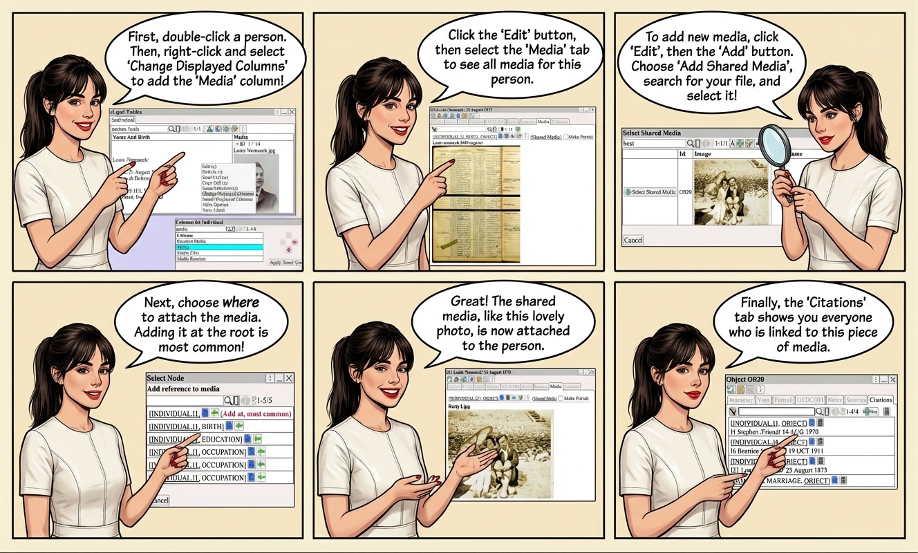 Adding Media![]() Media may be private or shared Shared media can be shared with other persons in the same GEDCOM file. Private media can't be shared with other persons. In this example we add a shared media (adding private media is similar) To attach a media citation to a person, Double Click on the person to edit Right Click ⟶ Change Displayed Columns to add the Media column to the table. ![]() and select Media to view the list of media for a person. ![]() to edit the list of media ⟶ Search for the media and ![]() Choose where to attach the media. ![]() The shared media is now attached. ![]() The citations for the media show who is using the media. ![]() |