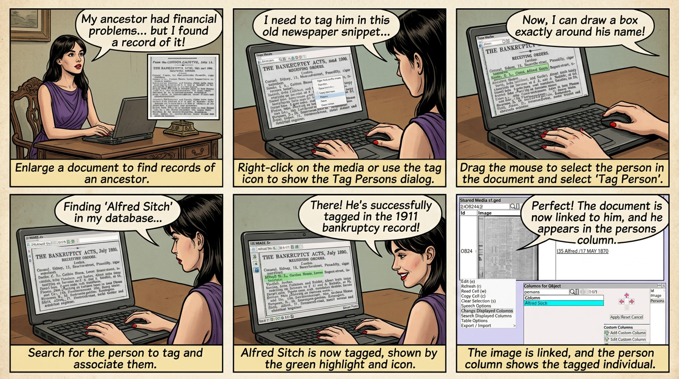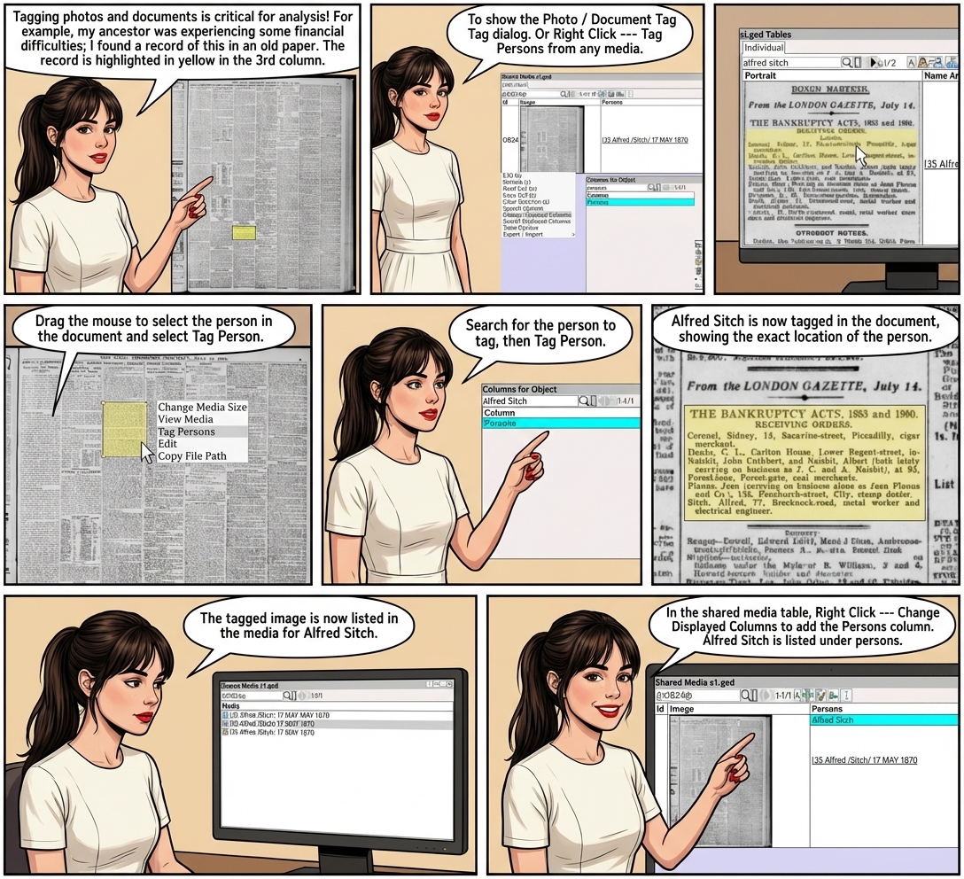 Tag Persons in Photos![]() Tagging photos and documents is critical for analysis. For example, my ancestor was experiencing some financial difficulties; I found a record of this in an old paper. I can enlarge the newspaper and tag the exact place in the newspaper for this record. The record is highlighted in yellow in the 3rd column of the newspaper (as shown below). ![]() to show the Photo / Document Tag dialog. Or Right Click ⟶ Tag Persons from any media. ![]() Drag the mouse to select the person in the document and select ![]() Search for the person to tag, then ![]() Alfred Sitch is now tagged in the document shows the location of the person in the document ![]() The tagged image is now listed in the media for Alfred Sitch ![]() In the shared media table Right Click ⟶ Change Displayed Columns to add the Persons column Alfred Sitch is listed under persons. ![]() |