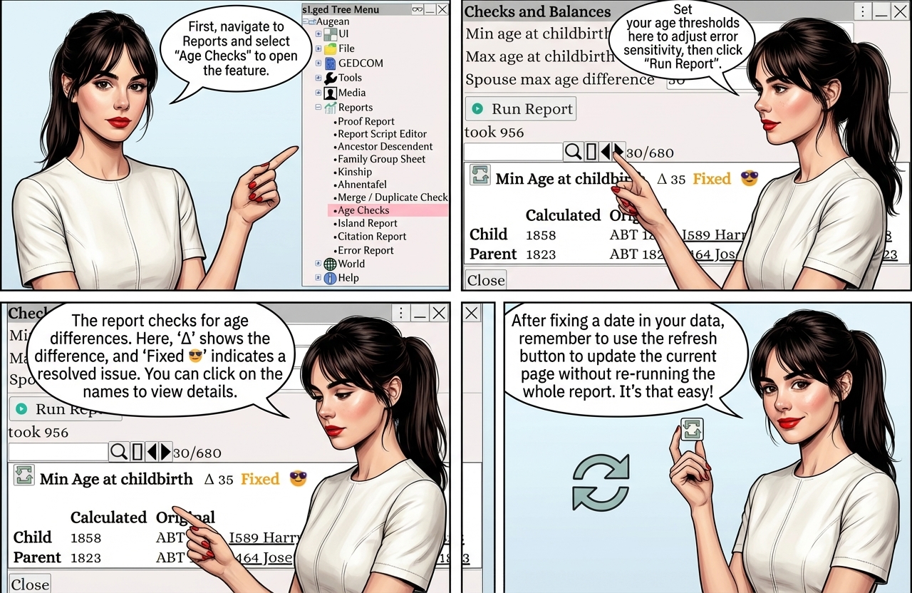 The age report checks the age difference between parents/children and spouses.