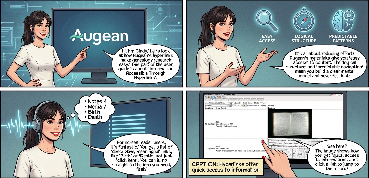 • Augean's Easy access to information through hyperlinks reduces the cognitive and physical effort required to find content, allowing users to navigate their genealogy easily. • Augean's Logical hyperlink structure and descriptive link text prevent users from becoming disoriented or lost within the application, a common challenge for users who cannot visually scan a page. • Consistent and predictable navigation patterns allow users to build a mental model of the software, making repeated use easier and less frustrating.