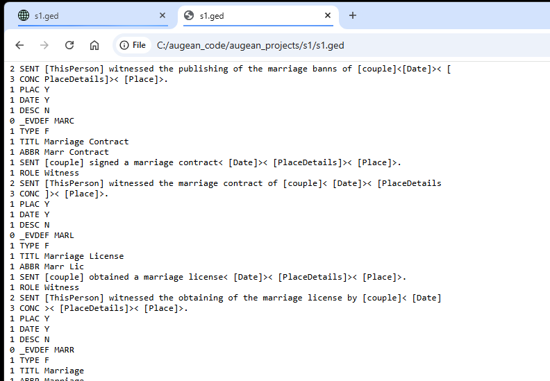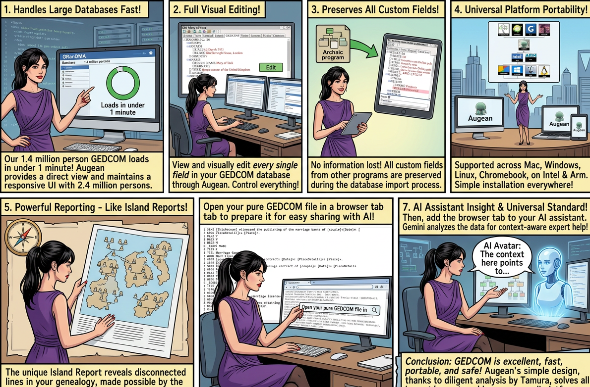 • Tested on Windows 10, Intel with 16GB of RAM. • Augean handles large databases and is responsive. ![]() Mennonite ancestry GEDCOM database, 1.4 million persons - Loads in under 1 minute Augean gives you a direct view of the GEDCOM. The large database performance is good. The user interface remains responsive even with 2.4 million persons. GEDCOM is a fast database. Augean uses Tables , which provides page information - handling the display of large files. 2. Safe When the GEDCOM file is saved, Augean uses an atomic write saving to a different file, then renaming to the original file. The database is therefore never partially saved; the information is protected. There is no danger of data corruption if the computer crashes while saving. 3. Easy to backup GEDCOM is easy to backup and transfer to new machines. Everything (Media and Data) is stored under one directory - just copy the directory. Augean works well with GitHub , for continuous one click backup of all media and data. 4. Every field can be viewed and edited. View and edit the GEDCOM database visually through Augean. • Every GEDCOM field can be viewed and updated visually. ![]() 5. All custom fields are preserved during a GEDCOM file import All custom fields are preserved during the database import process. • No loss of information when importing from any GEDCOM source. • Custom GEDCOM fields, which may have been created in other GEDCOM programs, are all preserved. ![]() Custom fields, in this case FootNote, are preserved during import 6. No loss of information when exporting to GEDCOM A non-GEDCOM database application would typically lose information during a GEDCOM export - for example Augean prevents the loss of information by using a pure GEDCOM database. 7. Portable across all platforms The GEDCOM database file format is portable across multiple platforms and architectures. Augean is supported on (Mac, Windows, Linux, Chromebooks)⨯(Intel, Arm) The GEDCOM database allows for a straightforward installation process. ![]() 8. No vendor lockin GEDCOM is a universal shared format which prevents Vendor lockin. Everything in Augean is in GEDCOM 5.5.1 AE, a universal shared standard with no vendor lock-in. 9. Enchanced reporting The database is loaded into memory, enabling the quick generation of reports. For example, the Reports ⟶ Island Report • An in-memory GEDCOM database enhances the type of reports that can be generated. ![]() • The island report, unique to Augean, provides insight into the different disconnected lines in your genealogy. The reports are possible because of the in-memory GEDCOM database. The GEDCOM database can be read directly by any GEDCOM application. If there is a third-party report you like that requires a GEDCOM file, you can run it directly on the Augean GEDCOM database file, with no need for export. 10. GEDCOM is understood by AI