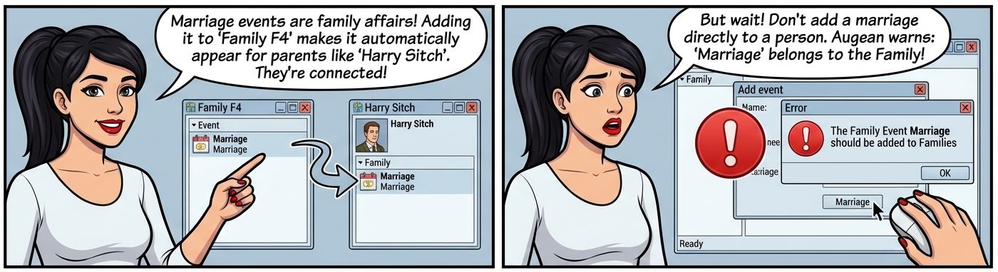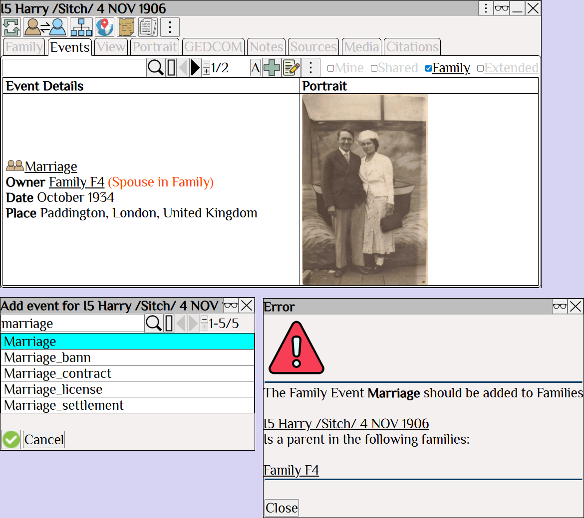 ![]() The arrow connecting the Family and Harry Sitch, shows Harry Sitch was a parent in the Family F4 If you try to add a Marriage event to a person, Augean warns that it should be added to the Family. ![]() Click Family to view the radius of the family events Families listed will have their events included in the extended event stream of the current person. For families were the current person is listed as a child, only the RESIDENCE and CENSUS events are included. ![]() |