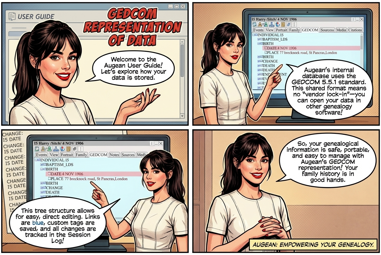 GEDCOM Represention of Data![]() Augean uses GEDCOM 5.5.1 for the internal database. All data is stored in GEDCOM format. Please also see why GEDCOM is an excellent choice for a database GEDCOM is the only supported shared standard for Genealogical information and avoids Vendor lockin. GEDCOM databases can be opened using other Genealogical software. ![]() • Links to GEDCOM structures are shown in Blue • GEDCOM 5.5.1 can be exchanged with other genealogical software without loss of information • All custom GEDCOM tags are preserved when importing GEDCOM. Augean enables easy and direct editing of the GEDCOM. • Changes for each GEDCOM object are recorded in the GEDCOM ⟶ Session Log . • The button is used throughout Augean to provide a view of the GEDCOM. The GEDCOM is represented as a tree structure, and long names are used for display purposes. When saved to a file, it is in pure GEDCOM format. ![]() |