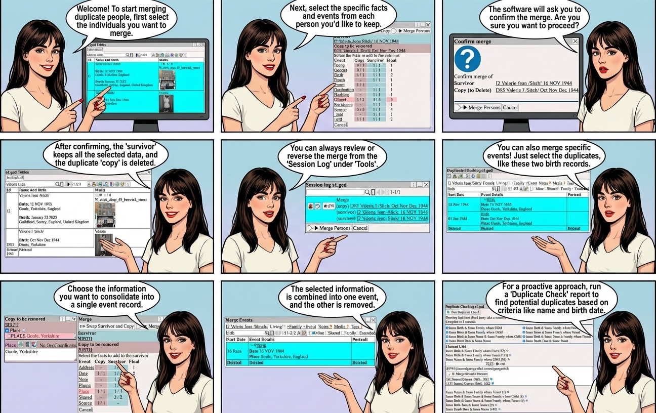 Merge Persons![]() Select the persons to merge. If only one person is selected, a dialog will appear allowing you to select the other person. Select ⟶ ![]() Select the events to include using The table shows which events are included. Select ![]() Confirm the merge ![]() The survivor has all selected facts and events and all family relationships. The copy is deleted. ![]() ⟶ Tools ⟶ Session Log will show the merge. The merge can be reversed from the session log. ![]() Merge events Events can also be merged. For example, use the search to find the Birth events and select both events. Then (Next to Mine) ⟶ Select the information to include. ![]() Select the information to include and select ![]() After the merge one event is deleted and the selected information is added to the other event. ![]() Duplicate Report ⟶ Reports ⟶ Merge / Duplicate Check to check for duplicate persons. Search and select on different criteria, for example Same Birth Date & Same Name The report lists possible duplicates. Select the persons to merge and ![]() |