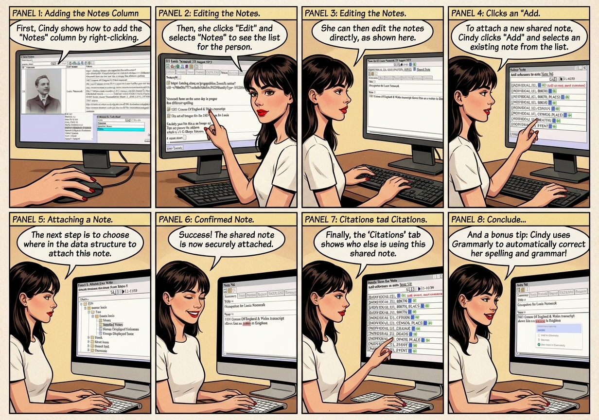 Adding Notes to a Person![]() Notes may be private or shared Shared notes can be shared with other persons in the same GEDCOM file. Private notes can't be shared with other persons. Private notes can be converted to shared notes using ⟶ In this example we add a shared note (adding a private note is similar) Right Click ⟶ Change Displayed Columns to add the Notes column to the table. ![]() and select Notes to view the list of notes for a person. ![]() to edit the list of notes ![]() ⟶ Search for the note and ![]() Choose where to attach the note. ![]() The shared note is now attached. ![]() The citations for the note show who is using the note. ![]() Grammarly can be used to correct spelling and grammar (and also to utilize AI to refine the wording). ![]() |