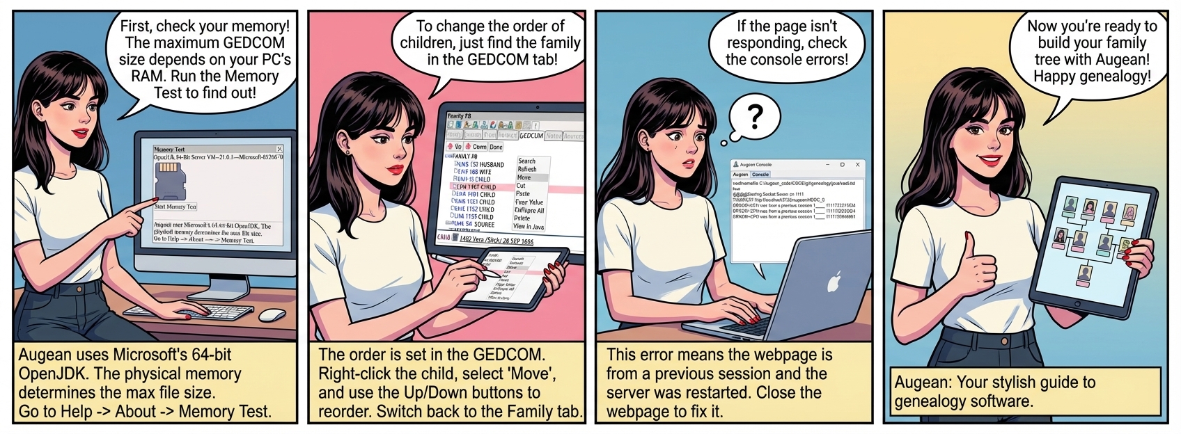 Frequently Asked Questions![]() Maximum Size of GEDCOM file supported Augean runs on Microsofts 64 bit OpenJDK 21 Server This enables efficient memory usage on your desktop computer. The physical memory on your computer determines the max size of files. Please run ⟶ Help ⟶ About ⟶ ⟶ ![]() Based on the physical memory in the system, Augean estimates out the maximum size of the GEDCOM file supported How to change the order of children Children are recorded in GEDCOM using Families . The order of the children, is determined by the order in the GEDCOM. To change the order, find the family for the child, and view the GEDCOM Right Click ⟶ Move to show the move buttons. Change the order using Switch to the Family tab, and press to see the updated order of the children. ![]() The Augean web page is not responding Check the console on the Augean server for any error messages In this case, the webpage belonged to a previous session, and the server had been restarted The previous session will not work with the current server; you have to close the webpage. ![]() |