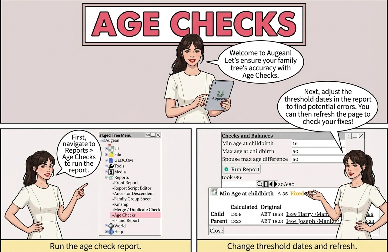 The age report checks the age difference between parents/children and spouses.