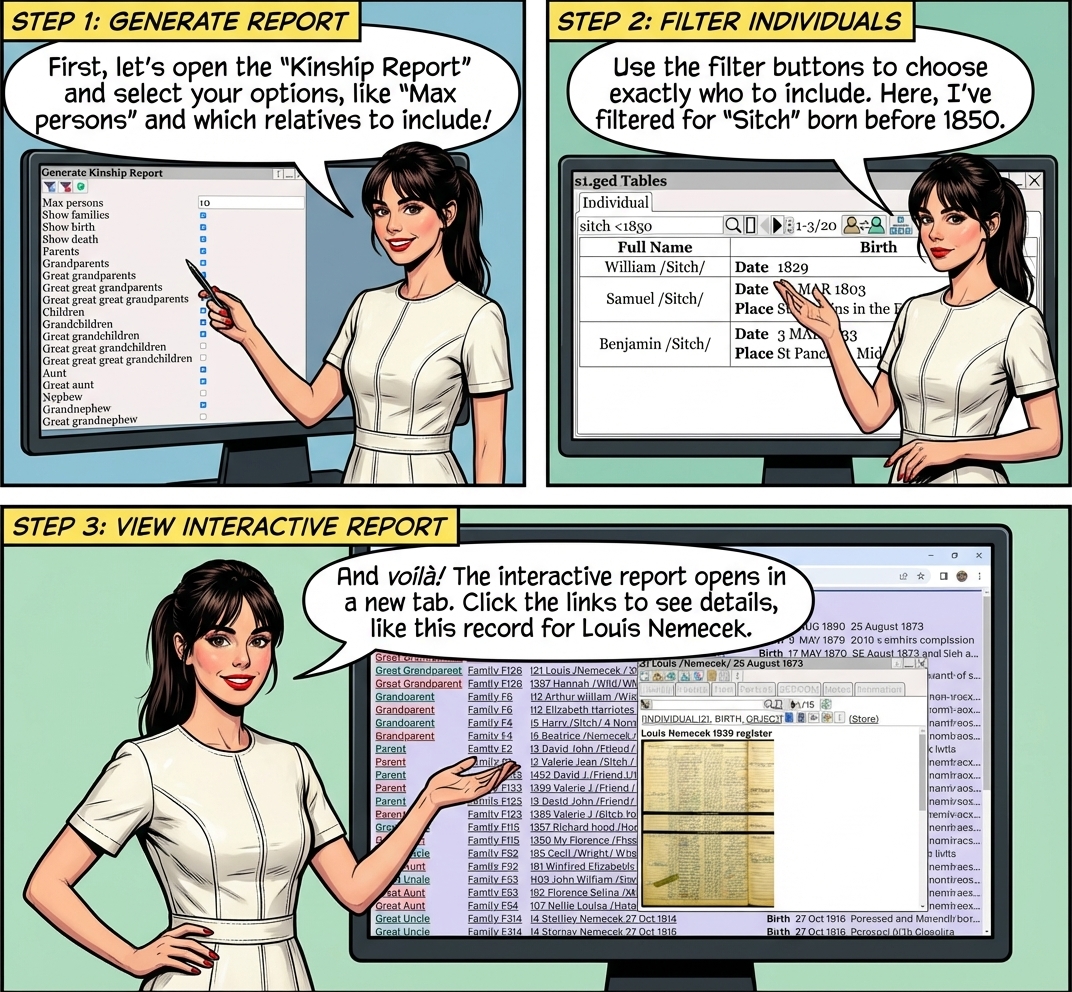 Kinship Report![]() Select the report using ⟶ Reports ⟶ Kinship ![]() By default, everyone is included in the report. to filter the individuals to include in the report. To clear the filter, and use everyone. ![]() The table shows all the persons who will be included in the report. (In this case, we are just including Sitch's born before 1850) Search Help for help on searching the table. Reports for single persons can be accessed through Person ⟶ ⟶ generates the interactive report. The report is generated and viewed in a new browser tab. The interactive report is displayed in a new browser tab. Click on the links in the report to view the person. ![]() |