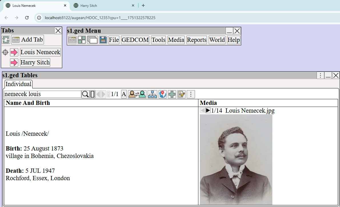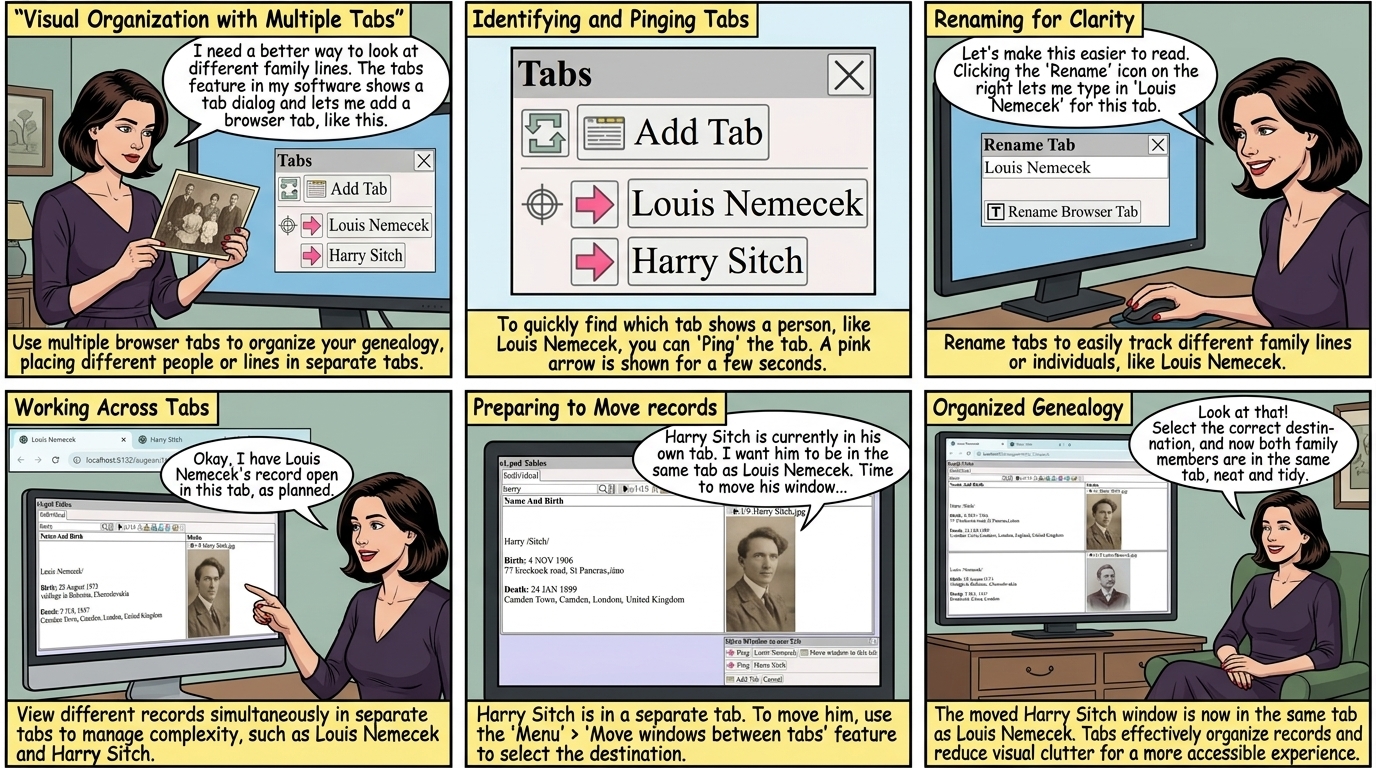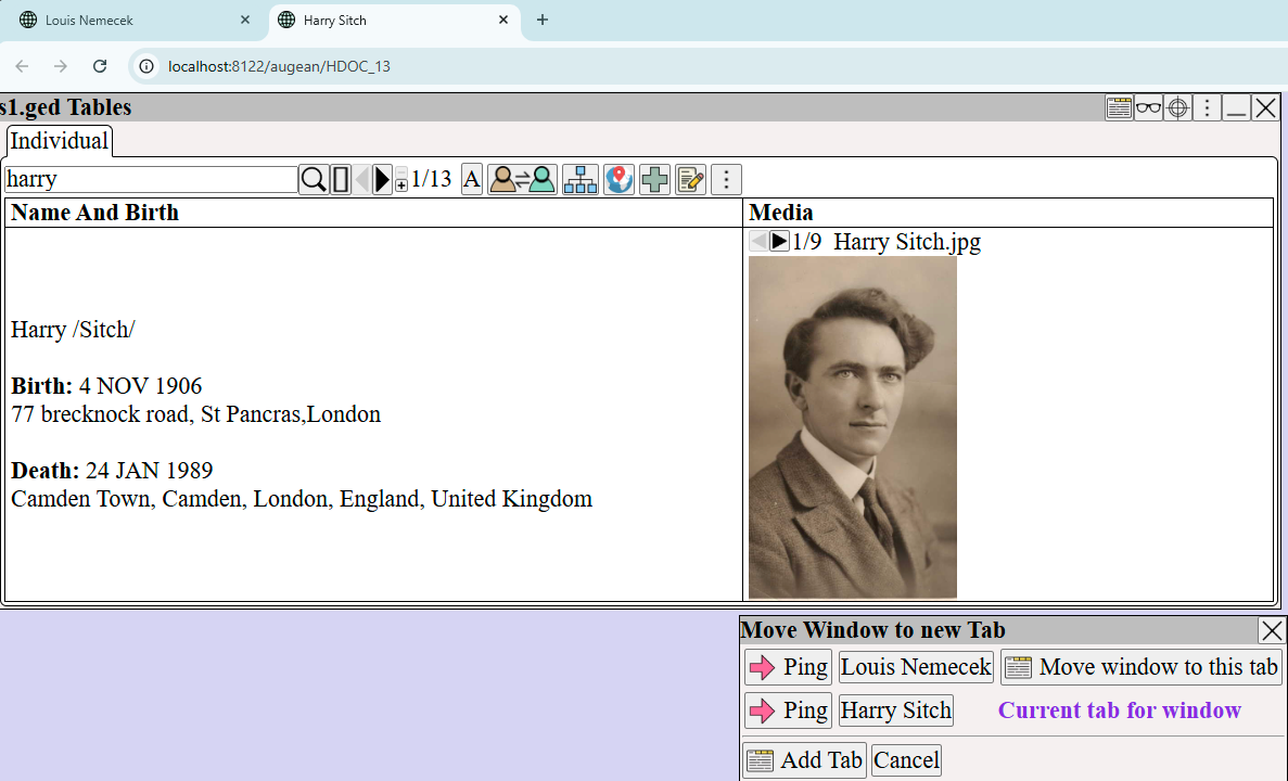 On the right of , click to rename the browser tab. ![]() Each tab, can track a different line or person. For example: ![]() Move Windows between Tabs Harry Sitch is currently in his own tab. We want to move him to be in the same tab as Louis Nemecek. Move windows between tabs, use ⟶ (from the top right of window to be moved) ![]() Select and the Harry Sitch will be moved to the same tab as Louis Nemecek, as shown below. ![]() Tabs are an effective way to visually organize your genealogy. Tabs reduce clutter on the screen, and make for a more visually accessible experience. Dual Screens Having multiple screens helps, especially when editing the preferences for a chart. Augean can be used on multiple screens by opening new browser tabs using Top right of window ⟶ ⟶ or Menu ⟶ |